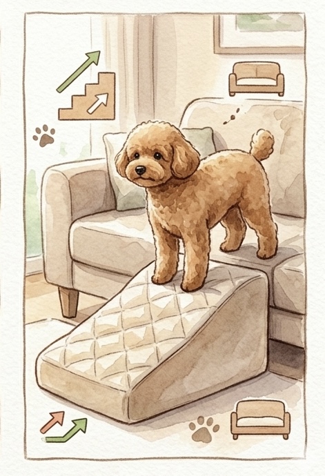 침대나 소파에서 뛰어내리는 동작은 관절에 치명적입니다. 반드시 슬라이드나 계단을 설치해 주세요.
