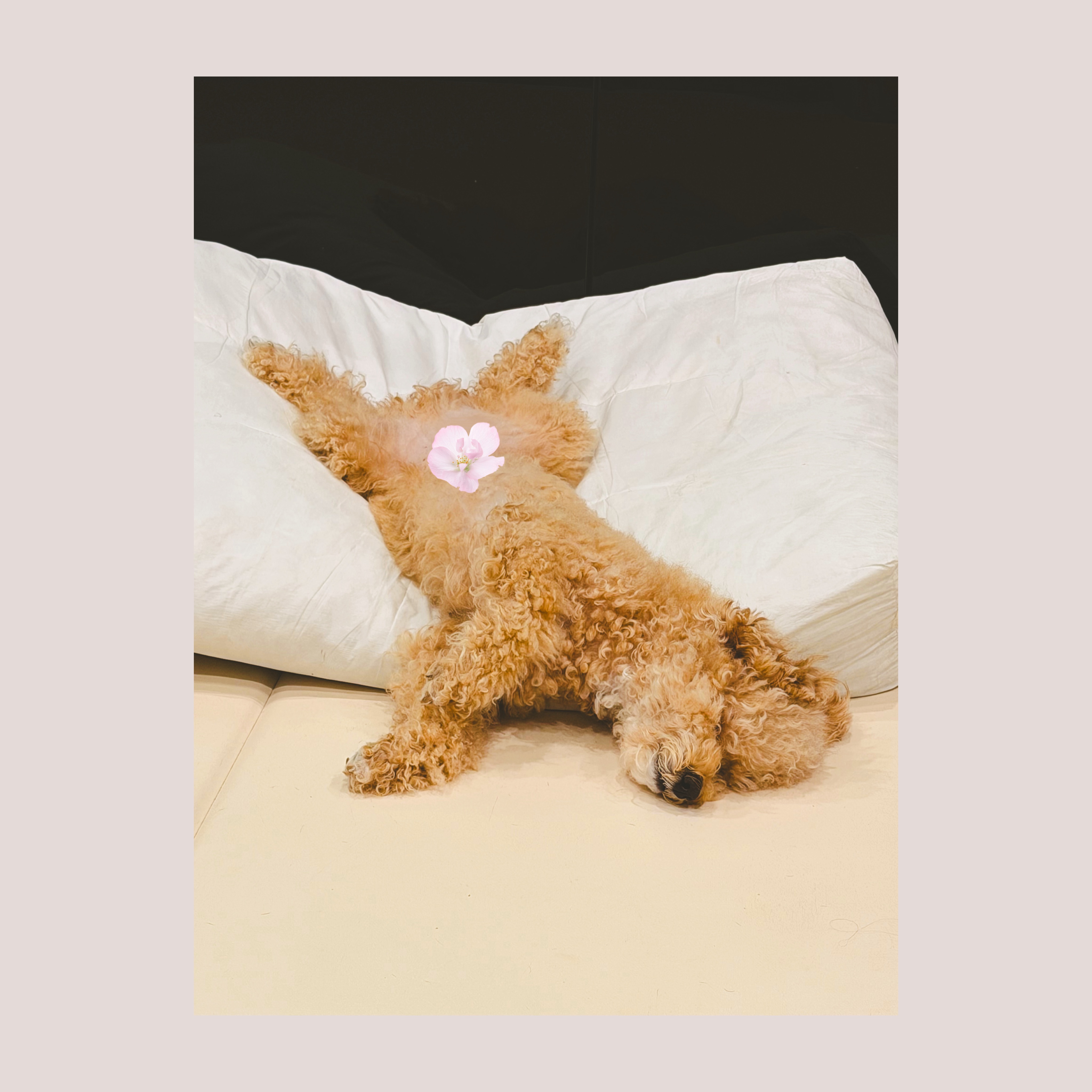 산책을 마치고 집에 돌아와 거실 바닥에 배를 하늘로 향한 채 '대자'로 뻗어 자고 있는 귀여운 푸들 로이의 모습입니다. 입가에는 아직 산책의 즐거움이 남은 듯 행복해 보이며, 햇살이 따뜻하게 내리 쨉니다.