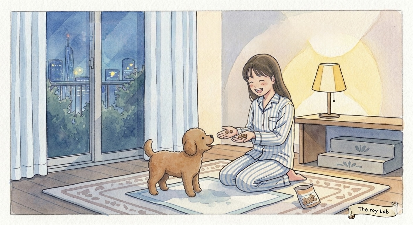 만약 강아지가 거실 바닥에 실수를 했다면, 보호자님은 속상하시더라도 꾹 참고 절대로 혼내지 말아야 합니다. 이미 볼일을 마친 후 시간이 지난 상태에서 혼내는 것은 아무런 교육 효과가 없습니다. 오히려 강아지에게 "배변 행위 자체"가 나쁜 것이라는 오해를 불러일으킬 수 있습니다.